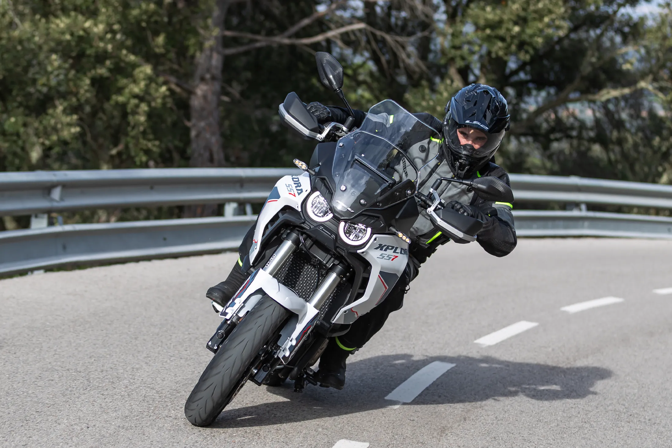 Brembo-bromssystemet ger kraft direkt, med en precis känsla i handtaget. XPLORA 557 har dubbla 320 mm bromsskivor fram och ett 4-kolvsok med radiell montering som levererar bromskraft som matchar hojens prestanda.